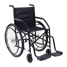 Fabricada em aço carbono, com assento/encosto em nylon, dobrável, freios bilaterais, aro impulsor bilateral, apoio para braços e pés fixos, rodas dianteiras aro 06" com pneus maciços e rodas traseiras aro 24" em alumínio com pneus infláveis.